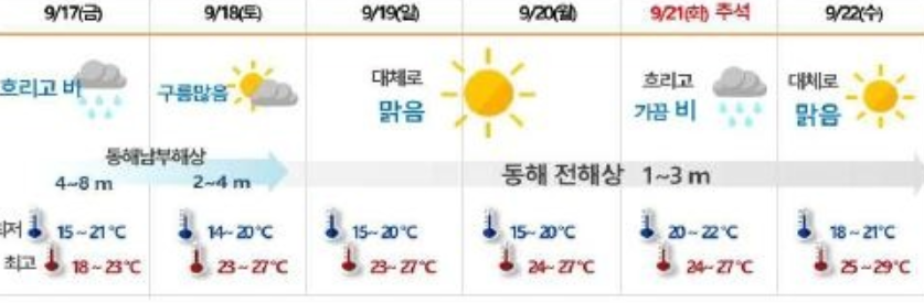 안녕하세요. 제 블로그를 방문해 주셔서 감사합니다. 곧 추석 연휴인데요 여러분들의 가정에 행복한 기운이 가득하시길 빕니다. 오늘은 연휴 기간 중의 전국 날씨를 알아보려고 합니다. 아래의