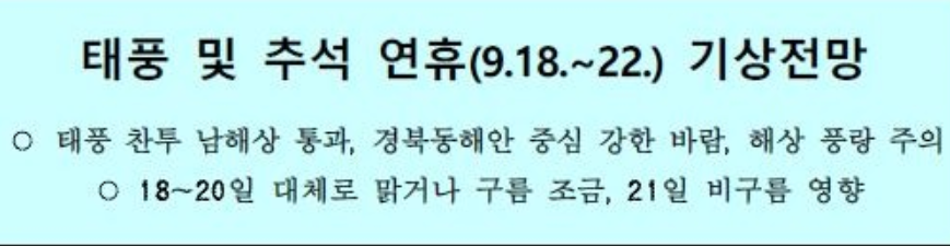 연휴기간 날씨는 야외 활동에 매우 적합하므로 여행이나 휴식하시기에 매우 적합할 것으로 예상됩니다. 하지만 9월 18일부터 태풍 찬투의 영향으로 남해안 지역의 파고는 4~8m에 달할 전망입니다. 따라서 연휴 기간 동안 남해안 섬 지역을 방문하신 후 배로 돌아오실 예정인 승객 분들은 여객선 운항정보에 유의하시기 바랍니다.