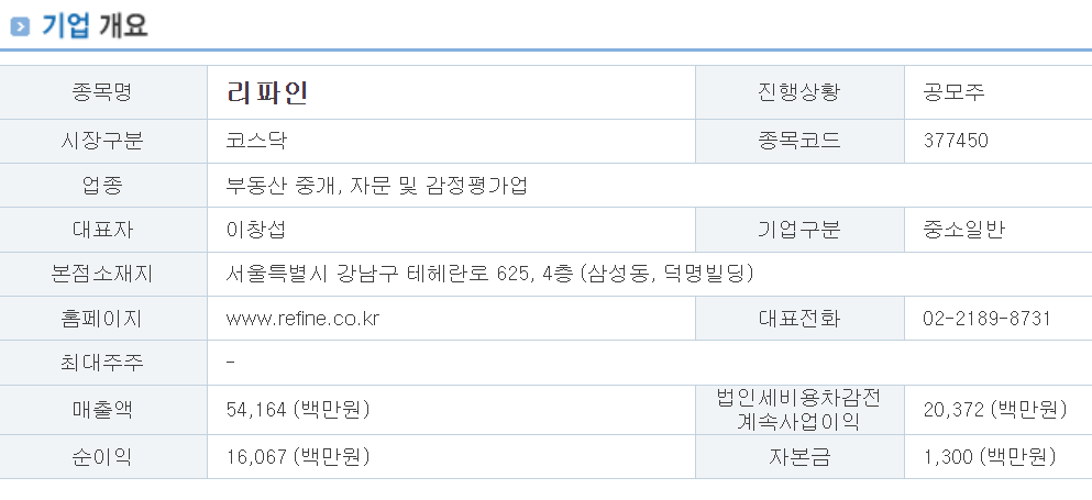 최근 금융 당국이 부동산 대출 규제를 강화하고 있기에 전세 대출에 대한 우려 섞인 목소리도 나오고 있는 상황이라서 이러한 리스크을 생각하면 리파인 공모가는 살짝 비싼 게 아닌가 생각됩니다.