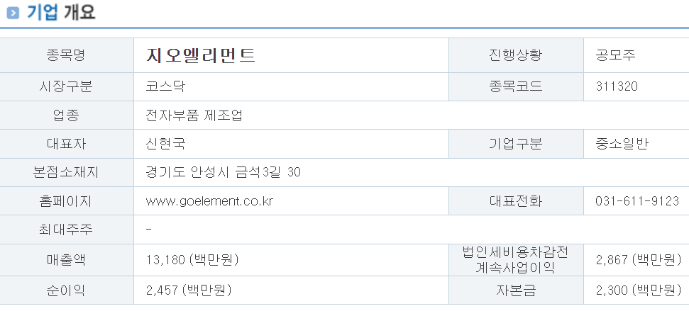 지오 엘리멘트는 반도체 공정 부품 소재를 만드는 업체입니다. 지오 엘리먼트의 공모가는 PER 12.8배를 적용했고 할인율도 31%로 비교적 높게 잡혀 있어서 공모가 산정에 있어서 과대포장된 부분은 없는 것 같습니다.