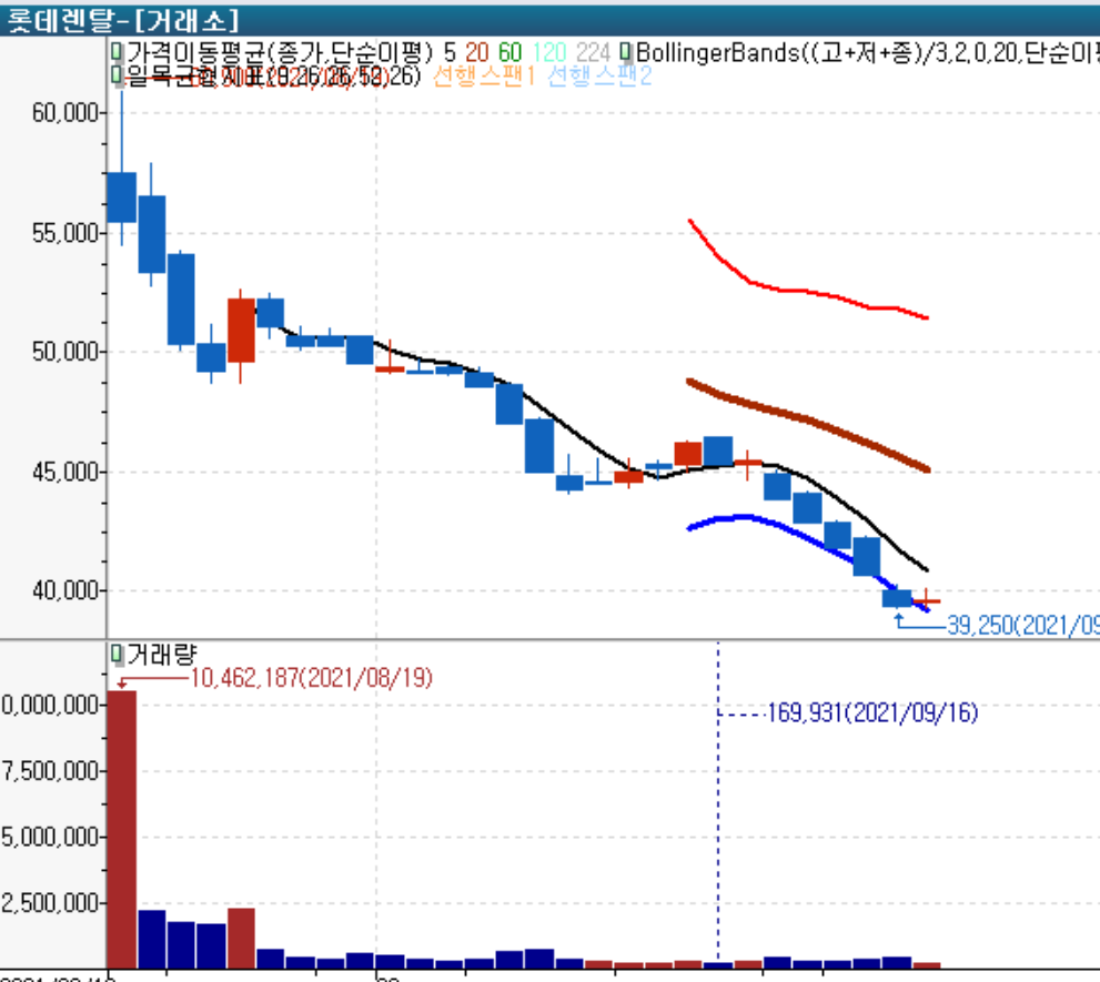 이걸 알아보기 위해서 케이카와 비슷한 조건인 롯데렌탈과 비교를 해볼 텐데요. 롯데렌탈 공모가가 5만 9천 원이었습니다. 최근 롯데렌탈 주가는 3만 원대까지 하락했는데요. 정말 꾸준히 하락하고 있는 종목입니다.