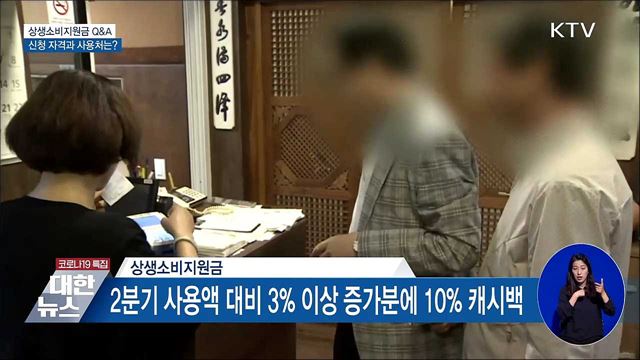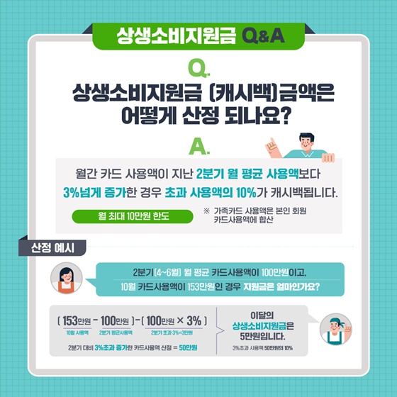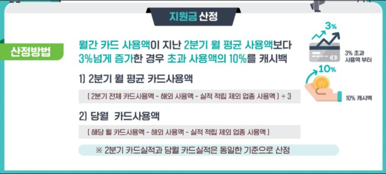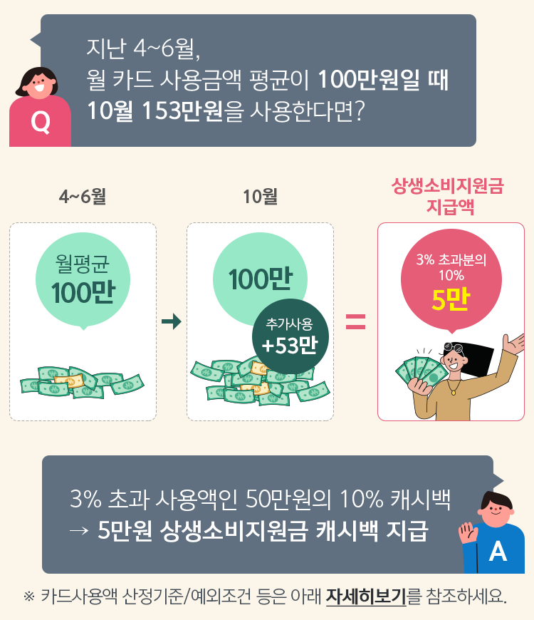 예를 들어 말씀 드리면, 월평균 신용카드 또는 체크카드 사용금액이 100만원인 회사원 김씨가 이번 달의 카드 사용금액이 153만원이라면, 월평균 사용 금액을 초과한 금애인 53만원 중에서 2분기 평균 사용금액의 3%(3만원)을 뺀 나머지 금액 50만원 중 10%인 5만원을 돌려주는 제도가 상생소비지원금입니다.
