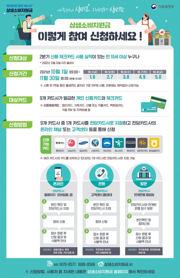 단, 신청 일자와 관계없이 캐시백 대상은 10월1일 지출액부터 인정된다고 합니다. 예를 들어서 10월 7일에 상생지원금을 신청하게 되면 10월7일부터 카드를 사용한 금액이 소비지원금 계산에 들어가는 게 아니라 그 이전인 10월 1일부터 사용한 금액이 상생소비지원금으로서 카운트 되는 것이죠.