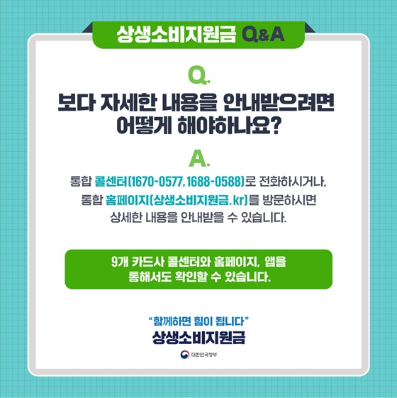 상생소비지원금의 한 명 당 캐시백 금액은 월별 10만원입니다. 생각보다는 금액이 크지 않네요. 그리고 상생지원금 사업의 총금액은 7,000억원으로, 이 금액이 모두 소진되면 이 사업이 조기에 종료될 수 있다고 합니다. 따라서 여러분들이 지원금액이 단 10만원으로 제한되어 있다는 것, 그리고 전체 재원이 모두 사용되면 조기 종료가 가능하다는 것을 염두에 두고 계획적인 소비를 하셔야 할 것 같습니다. 잘못하다가는 배보다 배꼽이 더 커져서 과소비를 할 수도 있겠네요.