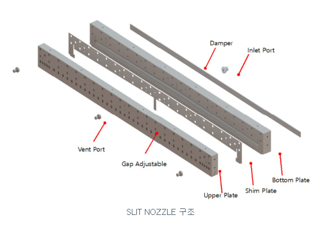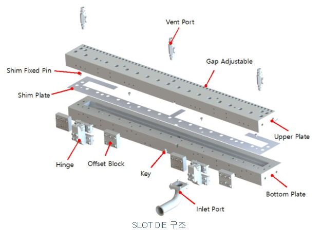 쉽게 말씀 드리면 2차 전지를 만들 때 대표적인 재료인 양극재의 원재료를 열처리해서 활물질로 만든 다음에 넓은 판에 골고루 뿌려줘서 도포를 해야, 발라줘야 됩니다. 이 때 사용되는 기계가 슬롯다이입니다. 슬롯다이는 양극재, 음극재의 활물질을 코팅하는 기계입니다.