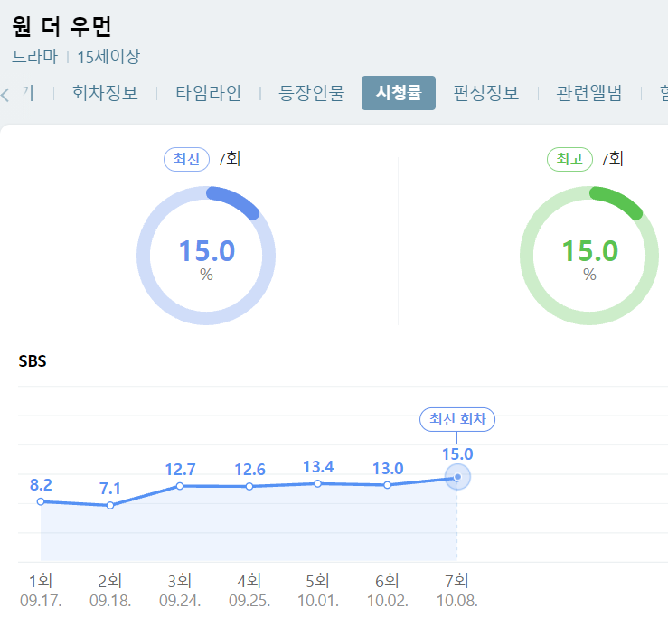 먼저 원더우먼 7화의 시청률을 아래와 같이 확인해 볼게요. 그냥 대박이라는 말 밖에 안나오네요. 금, 토 드라마는 그야말로 여러 인기 드라마의 각축전인데 무려 15% 시청률을 찍으면서 역대 원더우먼 회차 중에서 최고 시청률을 찍었네요. 이 드라마 이제 레전드로 가나요???