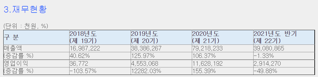 점점 재무 상태가 개선되는 것도 좋아 보입니다. 그리고 손익계산서를 보면 조금 전에 말씀 드린 것처럼 2020년부터 매출이 큰 폭으로 늘어났는데요. 2019년 대비 매출과 이익이 두 배 수준으로 늘어났습니다. 그런데 금년 상반기 손익을 보면 20년보다는 줄어들 것 같은데요.