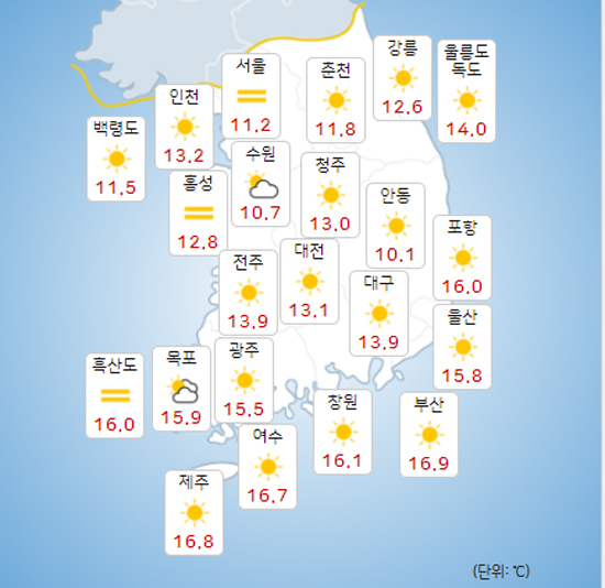 내일 아침 서울의 기온은 7도로 예상되고 내륙 지방 중심으로 5도 정도까지 내려서 오늘만큼 쌀쌀한 아침이 될 것입니다. 한편, 낮에는 18도 안팎까지 올라서 아침/낮의 기온차가 15도 이상 확대될 예정입니다.
