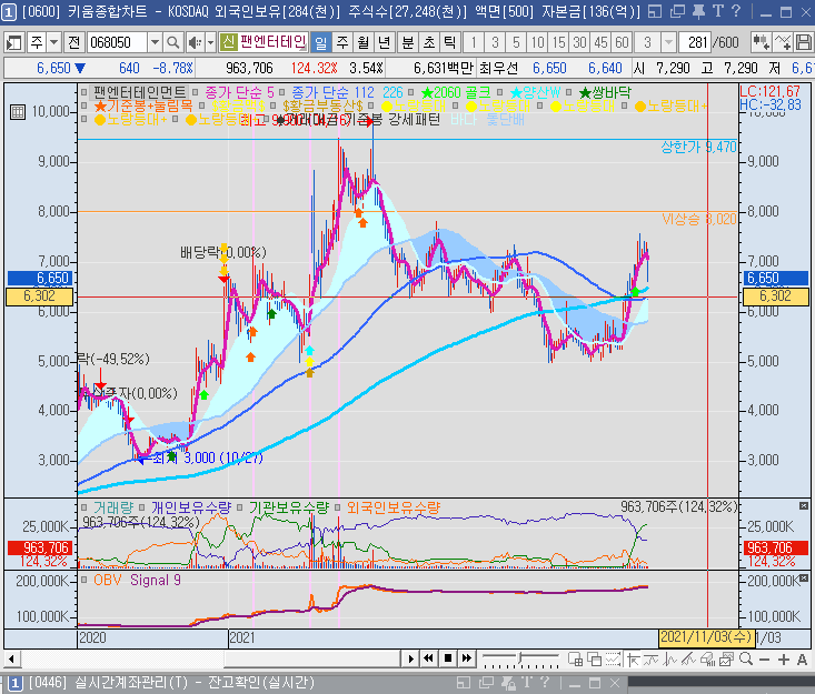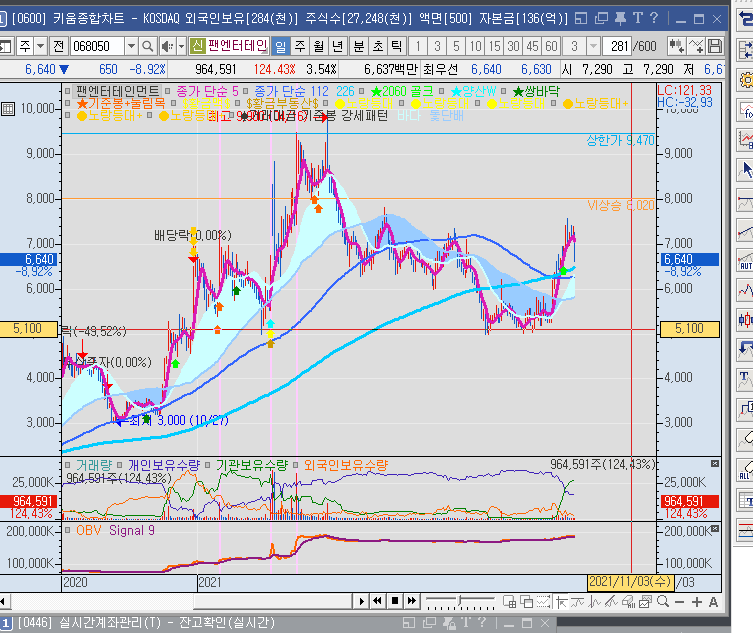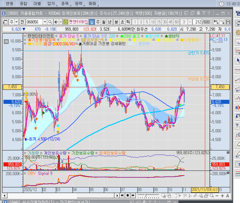 팬엔터테인먼트 주가는 일단 세력이 내렸다가 다시 올린 상태니까 더 내린 다음에 다시 오른다면 9,000원까지도 갈 수는 있을 거는 같은데 지금은 매수 시점이 아니라고 봅니다. 11월 3일 기준 팬엔터테인먼트 주가는 하방 VI까지 맞았는데,