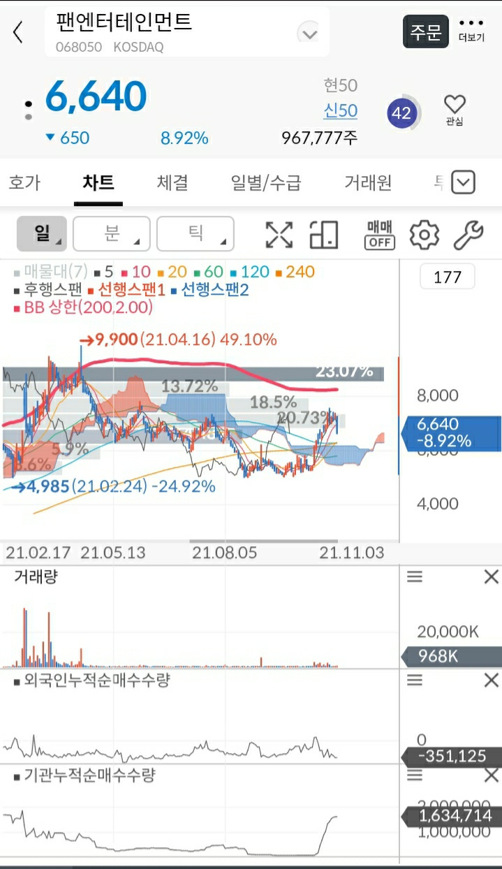이러면 조금만 올라도 본전 찾겠다고 파는 사람들이 많으니까 주가가 오르기 어렵죠. 따라서 팬엔터테인먼트 매수에 관심이 있으시다면 5,100원에서 지지받을 때 사거나 아님 무시하는 게 낫다고 봅니다.