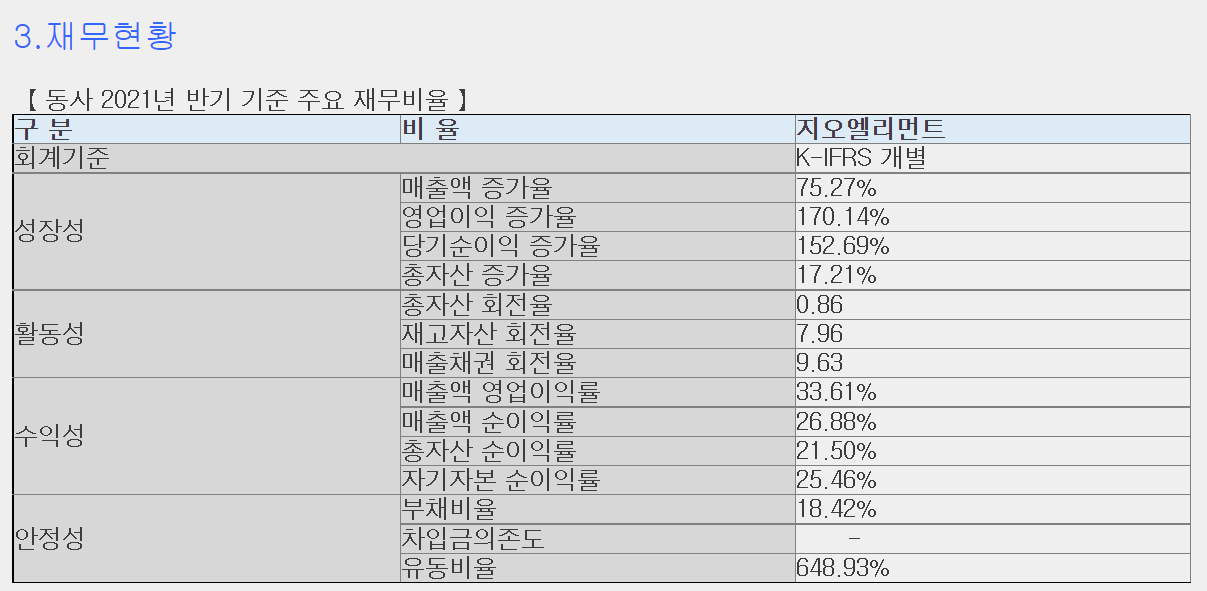 지오 엘리먼트 실적을 보시면 일단 2020년이 2019년보다 확실히 많이 성장을 했고 올해 역시 반기 기준으로 실적이 나왔는데 전년 동기에 비해서 상당히 많이 매출 증가를 했다라는 것을 알 수가 있습니다.